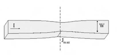Consideriamo una linea di metal nella quale passa una certa corrente I (Fig. 1.26) e supponiamo che una parte di questa linea, a causa di un imperfezione costruttiva, sia più sottile rispetto al resto della linea. La densità di corrente J=I/A (con A=sezione della linea) avrà un massimo proprio in corrispondenza di tale punto. I grani metallici che compongono la linea possono migrare seguendo il flusso della corrente, e tale migrazione è ovviamente tanto più forte laddove maggiore è la J. Nel nostro caso, tale fenomeno sarà particolarmente evidente nel punto in cui la linea è più stretta. Si innesca allora un fenomeno rigenerativo dato che, nel momento in cui i grani metallici migrano, la sezione della linea si riduce e ciò comporta un ulteriore aumento di J. Ciò può portare alla rottura della linea.