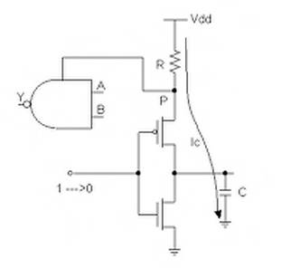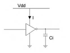 Per valutare la corrente media, consideriamo il circuito di Figura 1.27 (per semplicità consideriamo un invertitore che pilota una capacità, ma si potrebbe adattare ad una qualsiasi porta logica, dato che la potenza si esprime sempre allo stesso modo).