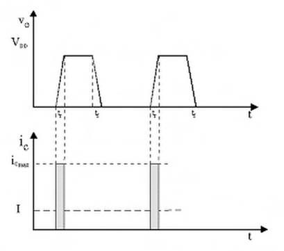 La corrente istantanea può essere stimata valutando l'andamento della tensione di uscita vo (Fig. 1.29) e ricordando che ic=C dvo/dt