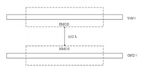Fra le varie regole di progetto, la più rilevante è quella relativa alla distanza (spacing) fra le regioni n-diff e p-diff, che deve essere maggiore o uguale a 1 , un valore molto maggiore rispetto alle
