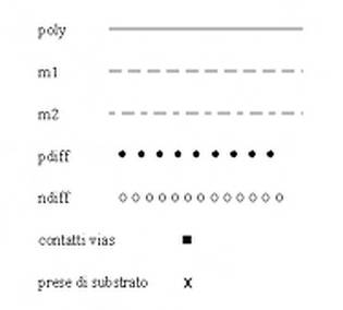 Ad esempio, al polisilicio si fa corrispondere una linea continua, al metall una linea tratteggiata, ai metal2 una linea tratto e punto, alla diffusione n una sequenza di cerchi vuoti, alla diffusione p una sequenza di cerchi pieni, i contatti sono rappresentati mediante dei rettangoli pieni mentre le prese di substrato con delle 'x'. Ovviamente, per ognuno di questi layers, non specifichiamo né le dimensioni, né la distanza fra loro. Lo stick-diagram ci serve solo per capire come in seguito sarà organizzato il layout. Ciò è molto importante perché ci sono degli algoritmi che consentono, in molti casi, di ottenere in maniera automatica il layout, e quindi lo stick-diagram. Vediamo adesso cosa succede quando due linee si intersecano in uno stick-diagram; le varie combinazioni sono riassunte nella Tabella 1.2.