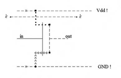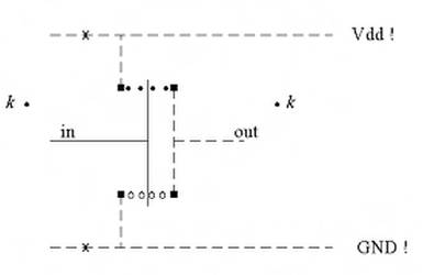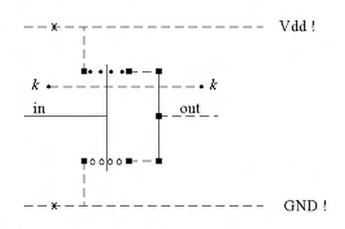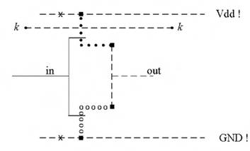 Ad esempio, lo stick-diagram di un invertitore sarà del tipo mostrato in Figura 1.32. Supponendo di dover passare una segnale k da sinistra a destra del circuito, la soluzione più immediata è quella di utilizzare una linea metal2. Supponiamo, però, di non poter utilizzare il metal2 (perché, ad esempio, ci sono altri due nodi da collegare, scavalcando anche il segnale k). Modifichiamo allora il nostro
