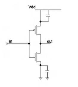 Lo schema circuitale di Fig.1.35 illustra la collocazione delle capacità aggiuntive che, per come è stata progettata la linea in polisilicio che collega le gate dei mosfet, sono disposte tra i terminali di source e substrato dei due mosfet. Ma, poiché queste due regioni sono connesse all'alimentazione (PMOS) ed alla massa (NMOS), queste capacità sono cortocircuitate e, perciò, ininfluenti.
