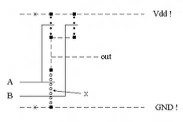 Come ulteriore esempio, riportiamo in Figura 1.37 lo stick-diagram di una porta NAND con ingressi A e B. Si noti che i due NMOS in serie sono semplicemente dati dall'adiacenza delle due linee di polisilicio della gate. A meno che non vi siano motivi per accedere al nodo X, non c'è la necessità di usare una via, ed il collegamento tra il drain del NMOS sottostante X ed il source del NMOS sovrastante X è dato dalla continuità della regione ndiff.