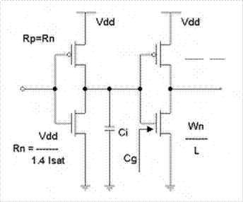 In definitiva, si ha che il nostro circuito è dimensionato a meno di un grado di libertà, che è il fattore Wn. Tale grado di libertà che abbiamo per l'invertitore nel nostro esempio, in realtà, lo possiamo avere per una qualsiasi porta logica CMOS. Ci si chiede, allora, come conviene scegliere questo grado di libertà: per rispondere a tale domanda analizziamo il tempo di propagazione del nostro circuito. Preventivamente dobbiamo valutare le capacità di carico, dovute alla capacità di gate dello stadio a valle (Cg e alle interconnessioni (Ci
