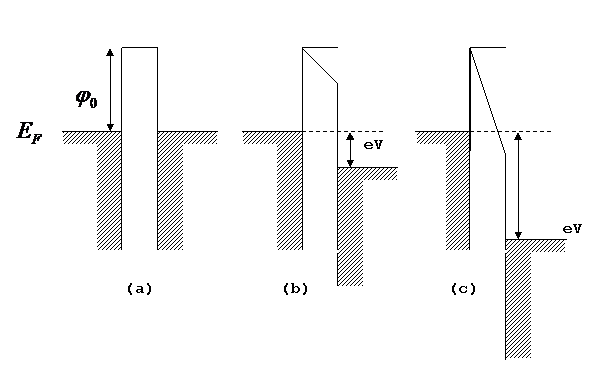 La corrente elettronica attraverso l'isolante può esistere se: (a) Gli elettroni negli elettrodi hanno abbastanza energia termica per sorpassare la barriera di potenziale, passando quindi nella banda di conduzione. (b) La barriera è abbastanza sottile da poter essere attraversata per effetto tunnel.