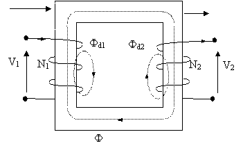 In figura è rappresentato lo schema costruttivo di un principio di un trasformatore in cui N1 ed N2 sono le spire degli avvolgimenti primario e secondario , è il flusso principale, Фd1 eФd2 sono i flussi di dispersione primario e secondario,V1 e V2 sono le tensioni primaria e secondaria.