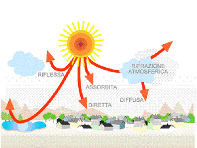 Di questa energia, solo una parte raggiunge la superficie della Terra:i gas dell'atmosfera e le nubi ne assorbono il 18%, il 31% è eliminato con la rifrazione atmosferica di pulviscolo e vapore acqueo, mentre il 51% riesce ad arrivare fino alla superficie del pianeta. Quest'ultima è la radiazione globale, che in parte raggiunge il suolo sotto forma di raggi solari diretti (radiazione diretta), in parte come luce diffusa dall' aria, dalle nubi e dal pulviscolo (radiazione diffusa). Anche la superficie terrestre a sua volta riflette una piccola parte, circa il 4%, della radiazione solare. In conclusione, la radiazione effettiva, cioè l'energia che viene realmente assorbita dal pianeta, ammonta al 47% della radiazione solare originaria.
