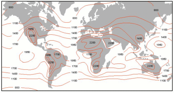 Riportata qui sotto c'è una mappa della radiazione solare che arriva sulla superficie terrestre. I numeri indicano quanta energia arriva, mediamente, su un metro quadrato di terreno orizzontale. In Italia arrivano circa 1400 Kilowattora per metro quadro all'anno, con punte fino a 1700 nelle zone costiere del Sud. Ciò significa che in media (tra giorno e notte, inverno ed estate, nuvole e bel tempo), su un metro quadrato, arrivano 160 Watt ogni ora. Questa energia luminosa può essere convertita in energia elettrica con i pannelli fotovoltaici con un'efficienza intorno al 10% ed in calore con gli impianti solari termici con un'efficienza tra il 30 ed il 60%.