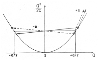 Fig. 1: Diagramma di energia che illustra l'origine del Coulomb Blockade del tunneling di un singolo elettrone in una giunzione polarizzata da un generatore di corrente. Le transizioni favorevoli dal punto di vista energetico sono rappresentate con linee continue, quelle sfavorevoli con linee tratteggiate.