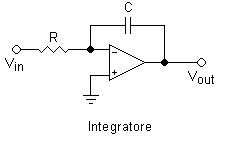 Nello schema elettrico è rappresentato l'integratore non limitato,dove la relazione tra tensione d'ingresso e quella d'uscita, supponendo che il condesatore sia inizialmente scarico,è:
