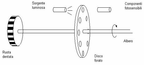 L'albero trasmette il moto al disco coronato da settori circolari opachi e trasparenti.