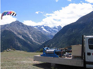 Il kite è manovrato srotolando e riavvolgendo le funi sui verricelli.