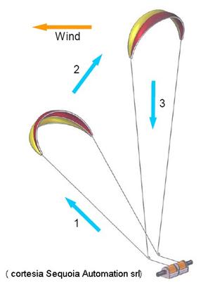 La manovra del profilo alare avviene regolando lo srotolamento e il riavvolgimento delle funi sugli stessi verricelli tramite i quali si ha produzione di energia.