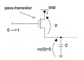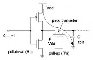 Abbiamo un invertitore CMOS cui è collegato un transistore in serie fra l'uscita e una capacità di uscita C (pass-transistor: transistore passante). Supponiamo di essere interessati al calcolo del tempo di propagazione tplh del nodo d'uscita (sulla capacità C), che si ha nel caso in cui l ingresso è zero (cioè l'NMOS è interdetto ed il PMOS conduce) e sulla gate del pass-transistor vi è 1 (e, quindi, anch'esso conduce). Come è noto, al posto del PMOS si considera la resistenza Rp all'NMOS si sostituisce Rn, e la costante di tempo sarà pari a C (Rn+Rp). Il problema è il valore di Rn che si considera al posto dell NMOS pass-transistor. In tal caso, infatti, questo NMOS funziona come pull-up anziché da pull-down, cioè serve per caricare una capacità anziché (come normalmente avviene) per scaricarla. Quando il transistore funziona da pull-up presenta una resistenza maggiore (R'n>Rn) a causa, ad esempio, della perdita della soglia (che non può essere portata in conto direttamente come differenza di tensione, ma come un aumento di ritardo ovvero come resistenza maggiore). In definitiva, quando un NMOS funziona da pull-up è meno efficiente di quando funziona da pull-down. Pertanto all'NMOS quando funziona da pull-up sostituiremo sempre una resistenza ed un interruttore, solo che la resistenza R n sarà maggiore di Rn, a parità di W/L. Quindi, il nostro simulatore switch-level può utilizzare due valori diversi di resistenza per 1'NMOS, in base al suo funzionamento da pull-up o da pull-down. Infatti, se l'ingresso dell'invertitore passa da 0 ad