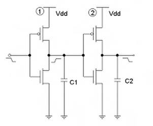 ovvero il tempo di propagazione del secondo stadio è funzione del tempo di salita del primo stadio. Tale dipendenza può essere abbastanza significativa e quindi, se trascurata, può portare a risultati abbastanza inattendibili. Si utilizzano delle tecniche semplificate per ottenere una stima della dipendenza di tphl2 dal tempo di salita trise1; l'analisi esatta risulta essere molto complicata in quanto ci saranno alcuni istanti di tempo (quando l'ingresso del secondo stadio non è né 0 né Vdd) in cui sia l'NMOS che il PMOS conducono entrambi, e valutare come si scarica la capacità non è affatto banale. Osserviamo che se la capacità C è molto grande e l'NMOS è molto piccolo il tempo di propagazione che ha il secondo invertitore è molto grande. Pertanto, in questa circostanza, sebbene il segnale d'ingresso al secondo stadio non sia proprio ideale ma abbia un piccolo tempo di salita, può dar luogo a delle variazione tutto sommato insignificanti sul tempo di propagazione. Viceversa, se la capacità C2 è molto piccola e l'NMOS è molto grande, per cui potenzialmente è in grado di scaricare la capacità in tempi molto rapidi, l'effetto del tempo di salita del segnale d'ingresso è determinante, ed è proprio tale tempo di salita che determina il tempo di propagazione. Possiamo introdurre un parametro (che indichiamo ancora con x) definito come;
