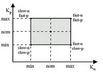 Resta da valutare l'espressione della funzione f(x); poiché i calcoli effettuati sono approssimati, non possiamo pretendere una espressione esatta per questa funzione. Pertanto, in molti casi questa funzione viene approssimata mediante una tabella, cioè si effettuano un certo numero di simulazioni al variare del tempo di ritardo del primo stadio e si valuta come varia il relativo ritardo del secondo stadio, tabulando la funzione f(x). Purtroppo, quando si realizza un circuito integrato, i parametri dei dispositivi realizzati non sono delle costanti, ma bisogna considerare ognuno di essi come una funzione aleatoria. Ad esempio, consideriamo il L di un transistor di test (con, ad esempio, W/L=2) e consideriamo un circuito integrato su cui realizziamo 1000 di questi transistor. Tutti i transistor non avranno lo stesso valore di K, ma si avrà una distribuzione statistica; in altri termini, si avrà un valor medio di K, poi un valore minimo ed un valore massimo. Tale discorso vale, ovviamente, non solo per il K ma per tutti i parametri dei dispositivi (capacità, tensione di soglia, ecc ). Si pone allora il problema di quali valori considerare di questi parametri quando si eseguono le simulazioni del nostro circuito. In generale, per ogni dispositivo, si considerano i tre casi typical, fast, slow, rispettivamente corrispondenti alle condizioni nominali, alle condizioni considerate le migliori per il dispositivo (il K è un po' più grande, la tensione di soglia un po' più bassa, per cui la corrente di saturazione è maggiore, ecc.) ed alle condizioni in cui il dispositivo risulta un po' peggiore della media. Generalmente, ciascun costruttore di dispositivi fornisce per i dispositivi a canale le tre schede. MODEL, corrispondenti ai casi typical, fast e slow, e garantisce che le caratteristiche dei dispositivi forniti sono contenute in questi estremi. Un discorso analogo varrà anche per le caratteristiche dei dispositivi a canale p: si avranno tre schede .MODEL, una per il caso tipico, una per il worst-case ed un'altra per il best-case. In questo modo è possibile identificare, per ogni parametro dei dispositivi, uno spazio. Ad esempio, per fissare le idee, consideriamo il parametro K. In un grafico rappresentiamo i Kn in ascissa ed i Kp in ordinata.