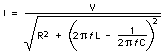 in cui L rappresenta l'induttanza, C la capacità e f  la frequenza della corrente considerata. La grandezza a denominatore nella frazione è detta impedenza del bipolo o del tratto di circuito in esame (a una data frequenza) ed è generalmente rappresentata con la lettera Z. L'impedenza può essere considerata come una generalizzazione della resistenza per i circuiti percorsi da correnti variabili nel tempo: infatti, se si pone f = 0 (corrente continua), l'impedenza Z si riduce alla semplice resistenza R. Dunque, in generale, la legge di Ohm per qualunque circuito elettrico può essere espressa nella forma I = V/Z.