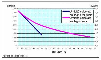 Infatti , come si vede dal grafico 1.1 , il contenuto di umidità fa decrescere significativamente il potere calorifico del legno e quindi del cippato ed inoltre questo sarà causa di deterioramento precoce ella caldaia .