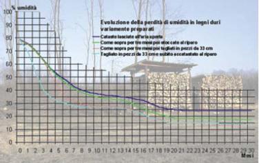 Come si vede dal grafico sottostante i tronchetti lasciati in cataste al riparo dalle precipitazioni arrivano ad un'umidità residua del 17% circa dopo 2 anni .