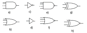 Schemi delle porte elementari: a) AND; b) OR; c) NOT; d) elemento neutro (f= x); e) NAND; f) NOR; g) XOR; h) EQ (detto anche XNOR)