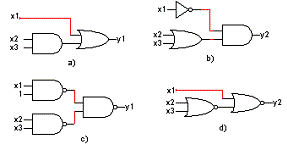 Una rete combinatoria debba elaborare i bit x1, x2, x3 fornendo un segnale alto y1 se è alto x1 oppure, simultaneamente, x2 e x3 e un segnale y2 alto quando, essendo basso x1, siano alti x2 oppure x3. Trasformando direttamente in termini di logica l'enunciato del problema, si ha: