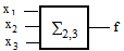 è una funzione a soglia del tipo '2 su 3' per la quale P = 2, n = 3 (si adopera talora il simbolo Σ2,3): essa è infatti alta se due o più variabili fra le tre sono alte e può essere indicata con il simbolo di figura