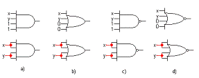 ; c) come a. in logica NAND; d) come b. in logica NOR
