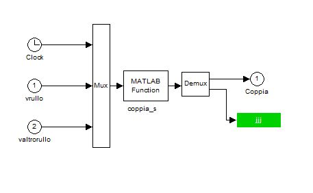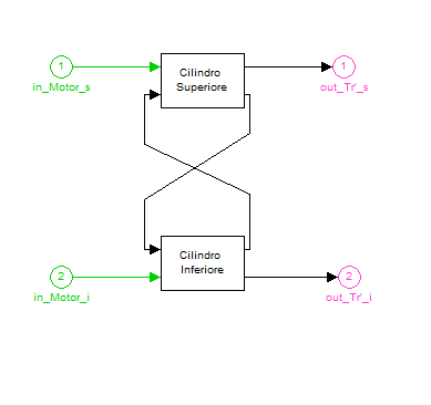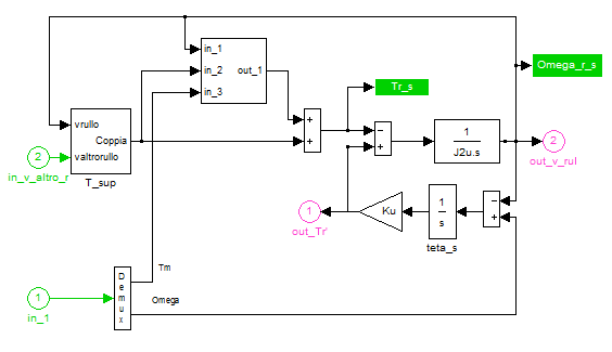 Il blocchetto T_sup e T_inf prende come ingressi le velocitą angolare dei due rulli ed il tempo e mediante una Matlab-function ,il cui codice č riportato in appendice A, calcola la coppia generata.
