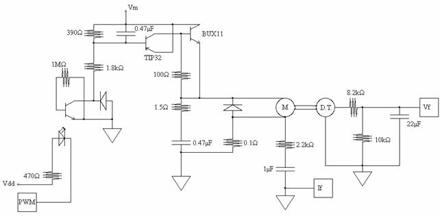 Invece qui sopra possiamo notare il grafico del circuito del servo-motore. All'inizio viene fatto una separazione galvanica (utilizzando fotocopiatore (diodo led e fototransistor)) tra il circuito di PWM e il circuito del servo-motore attraverso il campo magnetico. Quando l'uscita del PWM è zero il diodo led si accende. Questa luce andando alla base del fototransistor manda in conduzione e mette a massa il connettore. Conducendo il fototransistor manda in conduzione anche il transistor PNP (Tip32), perché la sua base viene attraversata da una corrente negativa. Ricordiamo che il transistor PNP funziona diversamente da NPN. Quando il transistor PNP è in conduzione anche il transistor NPN (Bux11) conduce perché la sua base viene attraversata da una corrente. Conducendo quest'ultimo la corrente passa al servo-motore che si mette in moto e la corrente va a massa attraverso la resistenza di 5W. Mentre il servo-motore è in moto la dinamo tachimetrica rileva la sua velocità e lo manda al PWM che a sua volta facendo delle comparazioni decide se continuare a fornire corrente al motore o usufruirsi dell'effetto volano, che viene usato quando il segnale del PWM è uno perché così il diodo e spento. Quindi il fototransistor non conduce e di conseguenza tutto il circuito rimane senza corrente finche non si usufruisce sufficientemente l'effetto volano che dopo il PWM prende il controllo.