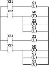 Se il contatore ha valore minore o uguale a 5, il motore M1 dev'essere avviato.Se invece il magazzino contiene più di 5 pezzi, una pressione del pulsante S2 provoca il movimento del nastro 1 e quindi l'ingresso di un pezzo in magazzino. Un tentativo di spegnimento tramite il pulsante S3 non porta alla disattivazione.del motore.