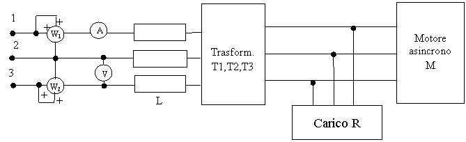 c) si trovi l'indicazione dell'amperometro A, del voltmetro V e dei wattmetri W1 e W2.