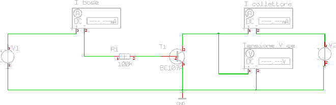 Si è montato su Bread-board il transistore BC107 con collegata alla base una resistenza di limitazione del valore di 100 KSi pone, attraverso l'amperometro, IB corrente di base fissandola nel primo caso a 10 mA, indi si da a VCE valori crescenti regolando opportunamente A 2, secondo i valori riportati in tabella e per ogni valore di tensione verificare il valore di corrente segnalato dell'amperometro posto in serie denominato IC esso misura la corrente che fluisce nel collettore la grandezza della corrente è misurata in mA quindi verrà posto il commutatore dell'amperometro su una grandezza adeguata nel nostro caso di 20 mA. Per tutta la prova si manifesta una leggera diminuzione della corrente di base, che verrà opportunamente resa costante variando il generatore A 1.