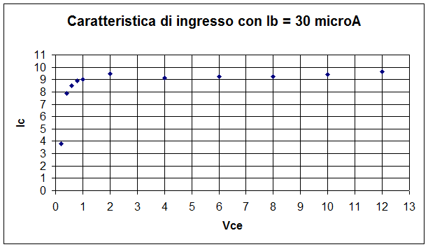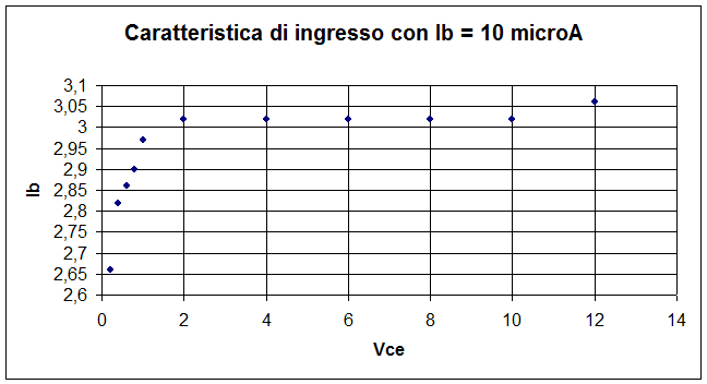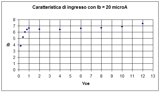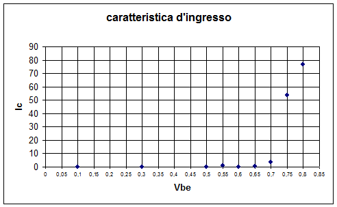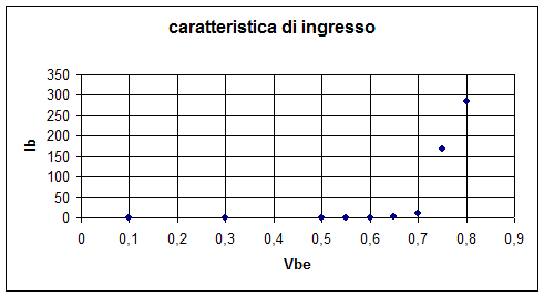La seconda parte dell'esperienza consiste nel rilevare il grafico che rappresenta la caratteristica di ingresso. Ossia l'andamento della corrente di ingresso IB in funzione della tensione VBE per valori costanti della VCE. Vengo rilevati e riportati nella tabella VBE , IB , Ic.