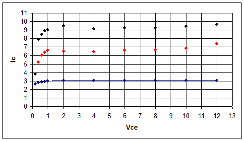 Rilevati tutti i dati si effettuerà il grafico, viene espressa la funzione Ic = f (VCE, IB) , essendo tre grandezze viene posta IB ad un valore e nel grafico viene inserito nell'asse delle ascisse VCE e nell'asse delle ordinate IC. Nei tre casi il grafico si alza aumentando IB quindi aumentando la corrente di base viene aumentata anche la corrente che può fluire nel collettore.