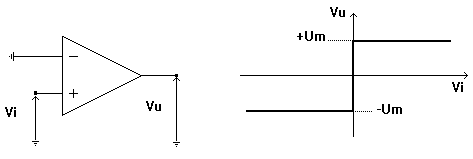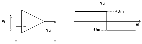 Come si può vedere in figura, questo circuito rileva il passaggio per lo zero della Vi. Essendo il segnale di ingresso applicato al terminale (-), l'uscita Vu sarà uguale a +Um se Vi è maggiore di zero e -Um se minore di zero.