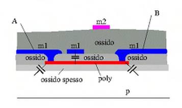 Osserviamo che lo strato di polisilicio è depositato su uno strato di ossido spesso (dato che non vogliamo realizzare un mosfet). Anche per il polisilicio possiamo esprimere la capacità come un