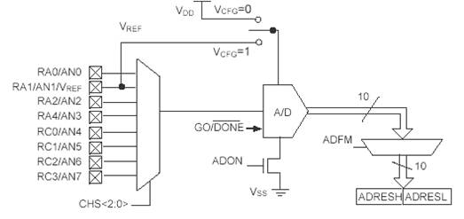 rappresentazione binaria a 10 bit. La funzionalità del dispositivo è controllata dai tre registri ANSEL,ADCON0, ADCON1. Di seguito è riportato lo schema interno del dispositivo: