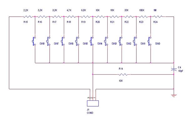 Il partitore resistivo a "switch case" è dimensionato a partire da 1MΩ per il tasto 1 (circa 500mV in uscita) fino a 2.2KΩ per il tasto 9 (oltre 4.5V). La tensione in uscita dal tasto 1 deve essere infatti più piccola di quella in uscita dal tasto 2 e così via.