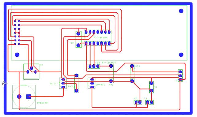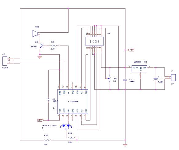 Sul secondo blocco troviamo invece il PIC16F684, LCD,lo speaker e lo stabilizzatore di tensione LM7805.
