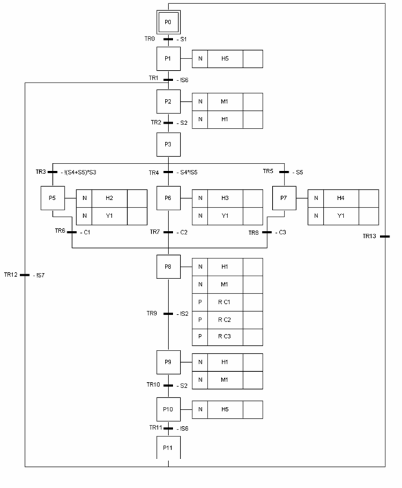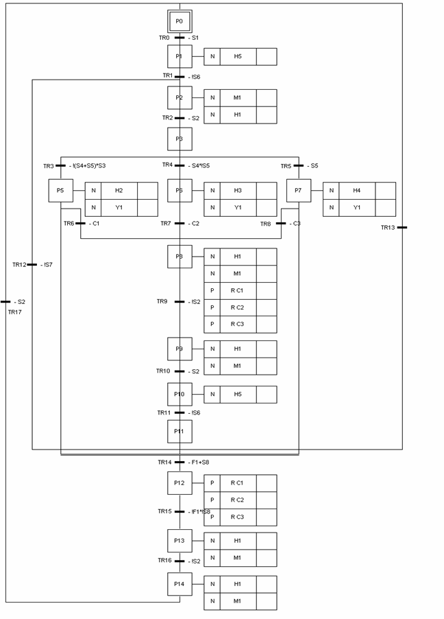 In definitiva, lo schema SFC di cui tener conto per la traduzione in ladder è quello riportato nella figura seguente: