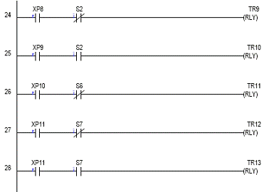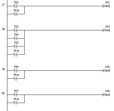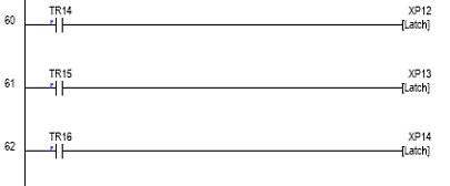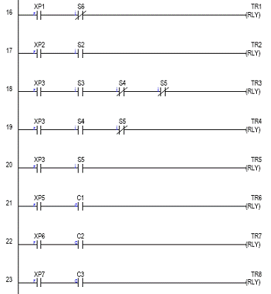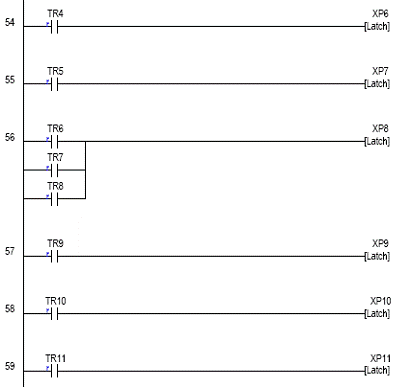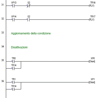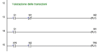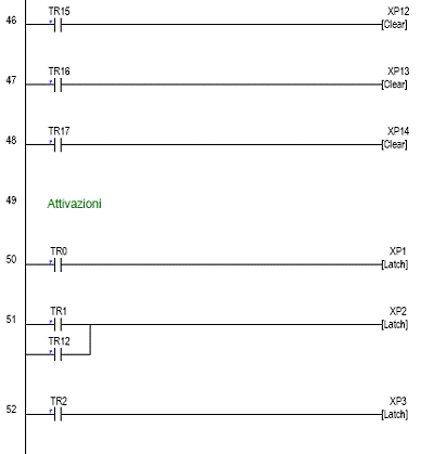 Si può osservare che nella sezione di inizializzazione il latch di XP0 è effettuato, oltre che tramite il bit 1st scan, anche mediante i marker di transizione TR13 e TR17, che andrebbero messi nella sezione di aggiornamento della condizione. Ciò è stato fatto perché Trilogy richiede, qualora una bobina sia alimentata da più contatti, che questi ultimi siano messi tutti in parallelo in un unico rung, senza la possibilità di disporli su rung separati per operare una maggiore separazione funzionale delle diverse sezioni.