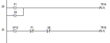 Infine, per la gestione delle emergenze si è utilizzata una sola transizione (TR14) che segue tutte le fasi dell'SFC (vedere figura seguente). Normalmente nel linguaggio SFC ciò corrisponde ad una sincronizzazione tra le fasi, quindi la gestione delle emergenze realizzata in questo modo non è corretta (tutte le fasi devono essere attive per rendere la transizione superabile). Tuttavia in ladder è sufficiente inserire come condizione di superabilità della transizione TR14, l'attivazione di F1 (relé termico del motore) o l'attivazione del pulsante di emegenza S8, senza considerare le fasi precedenti.