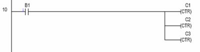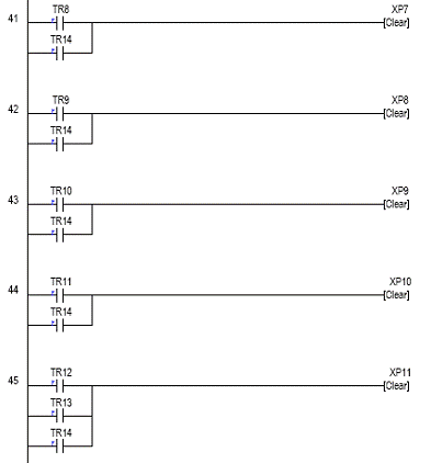 Si nota che in un unico rung vengono aggiornati sempre tutti i contatori. Ciò non dà luogo a problemi perché solo una delle fasi P5, P6 o P7 sarà attiva, a seconda della scelta fatta sul numero di pastiglie. Quindi solo una tra le transizioni TR6, TR7 o TR8 sarà superabile (vedere schema SFC).