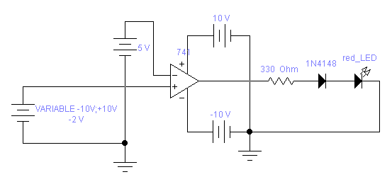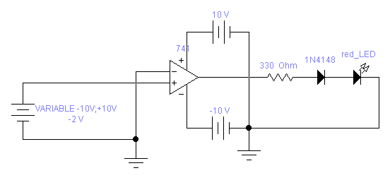 Nella prova in uscita abbiamo collegato un led rosso. Questo led risulta acceso quando la tensione da comparare č positiva quindi superiore a quella di riferimento mentre risulta spento quando la tensione da comparare č negativa o inferiore. Per evitare danni al led si č prevista una resistenza limitatrice e un diodo che si occupa di limitare la tensione di braek down in quanto la tensione inversa sarebbe dannosa per il diodo led che ha tensione di break down molto bassa.