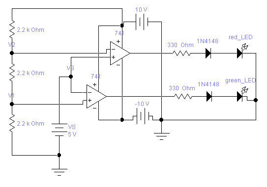 dove se 3.4V<Vs<6.74V le uscite Va e Vb saranno negative e i led spenti come detto in teoria e verificato con la prova. Se invece Vs<3.4V il led green alimentato da Vb si accende mentre il led redč spento; se invece Vs>6.74V si accende il led red e il green č spento.