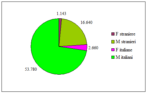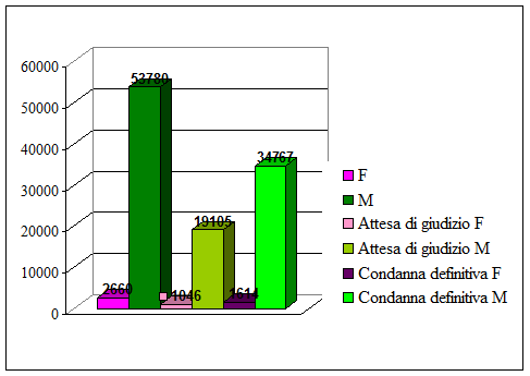 L'elaborazione effettuata dall'Ufficio per lo sviluppo e la gestione del sistema informativo automatizzato, sezione statistica del Dipartimento dell'Amministrazione penitenziaria, aggiornata al 30 giugno 2004 e resa pubblica dal Ministero della Giustizia[3], ha evidenziato che in Italia ci sarebbero 56.440 detenuti, di cui 2.660 donne e 53.780 uomini. Tra questi, 20.151 pari al 35,65% sono in attesa di giudizio, di cui 1.046 donne (39,32%) e 19.105 uomini (35,46%); 36.381 pari al 64.35% hanno subito una condanna definitiva, di cui 1.614 donne (60,68%) e 34.767 uomini (64,54%).