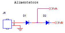 Come è possibile vedere nello schema, la tensione proveniente dal jack di connessione viene ridotta tramite il diodo D1, che protegge anche dal collegamento errato della batteria. Un ulteriore riduzione è ottenuta tramite il diodo D2. Come si può notare, la tensione 5VA è prelevata subito dopo il diodo D1. Questa tensione è utilizzata per l'alimentazione dei motori. La tensione 5VD invece viene utilizzata per alimentare tutti gli altri componenti del circuito.
