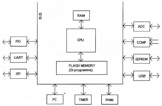 Il cuore del microcontrollore è una CPU, che preleva le istruzioni presenti nella memoria flash e eeprom. La memoria RAM di lavoro contiene soltanto i dati che risultano separati dal programma. Le periferiche più comuni sono: