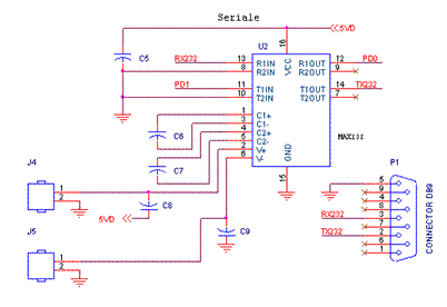 La porta seriale del microcontrollore, realizzata con il MAX 232, consente di interfacciare l'ATMEGA8535 con il mondo esterno. Questa porta in particolare consente anche di effettuare il debug dei programmi utente durante la fase di programmazione. |